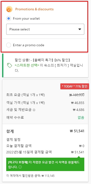 본인이 갖고 있는 프로모션 코드가 있다면 코드를 입력, 할인받을 수 있지만 코드가 없다면 오른쪽 이미지 같이 발급받은 쿠폰을 사용하시면 됩니다. 위 쿠폰을 선택하면 최종 가격에서 추가로 할인된 요금으로 예약할 수 있습니다.